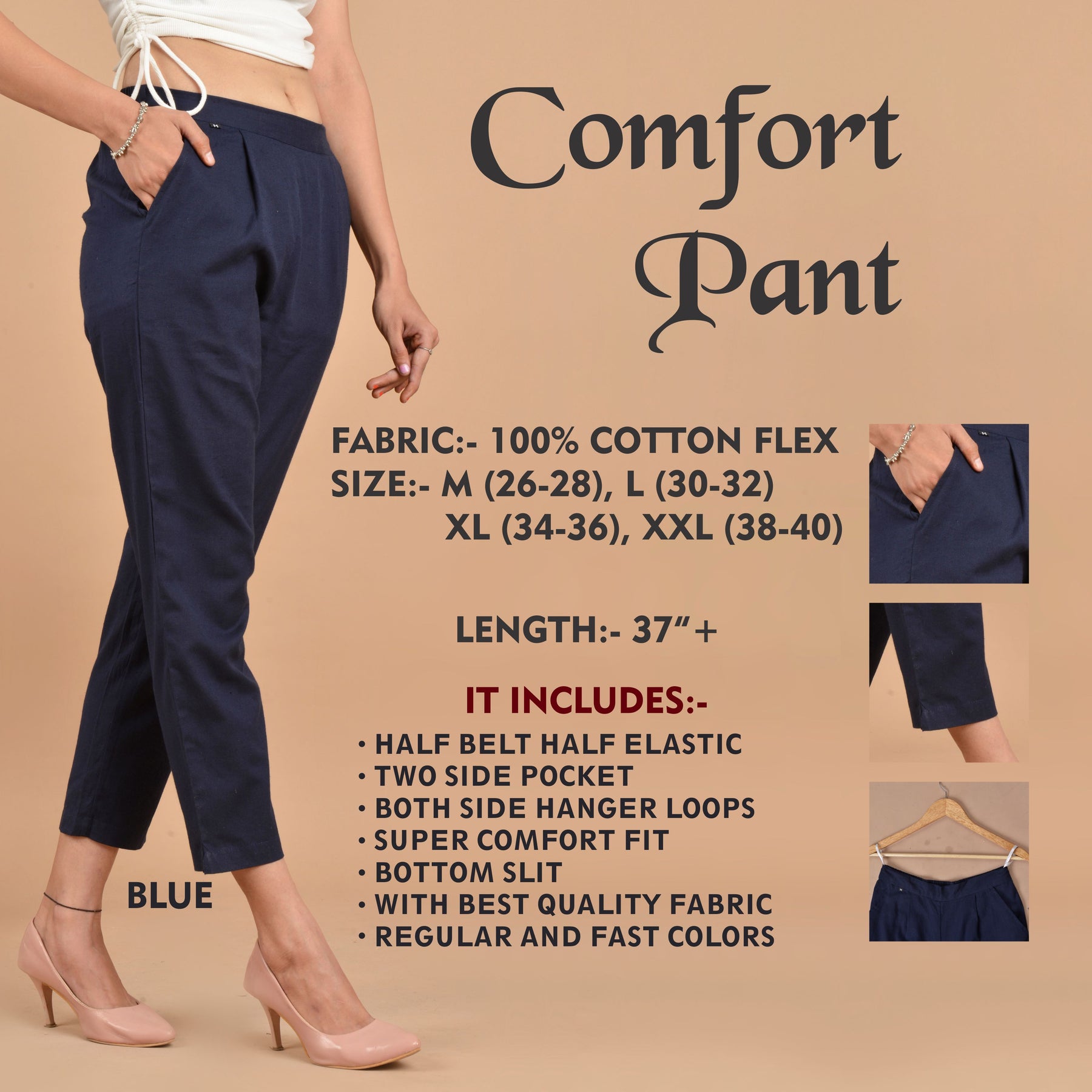Navy Blue Cotton Flex Trouser or Pant For Women's
